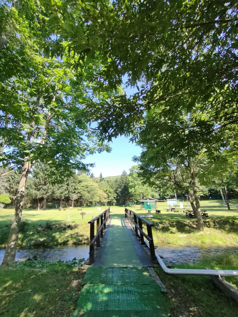 沢山の木々や川、芝生にススキ等、自然豊かな