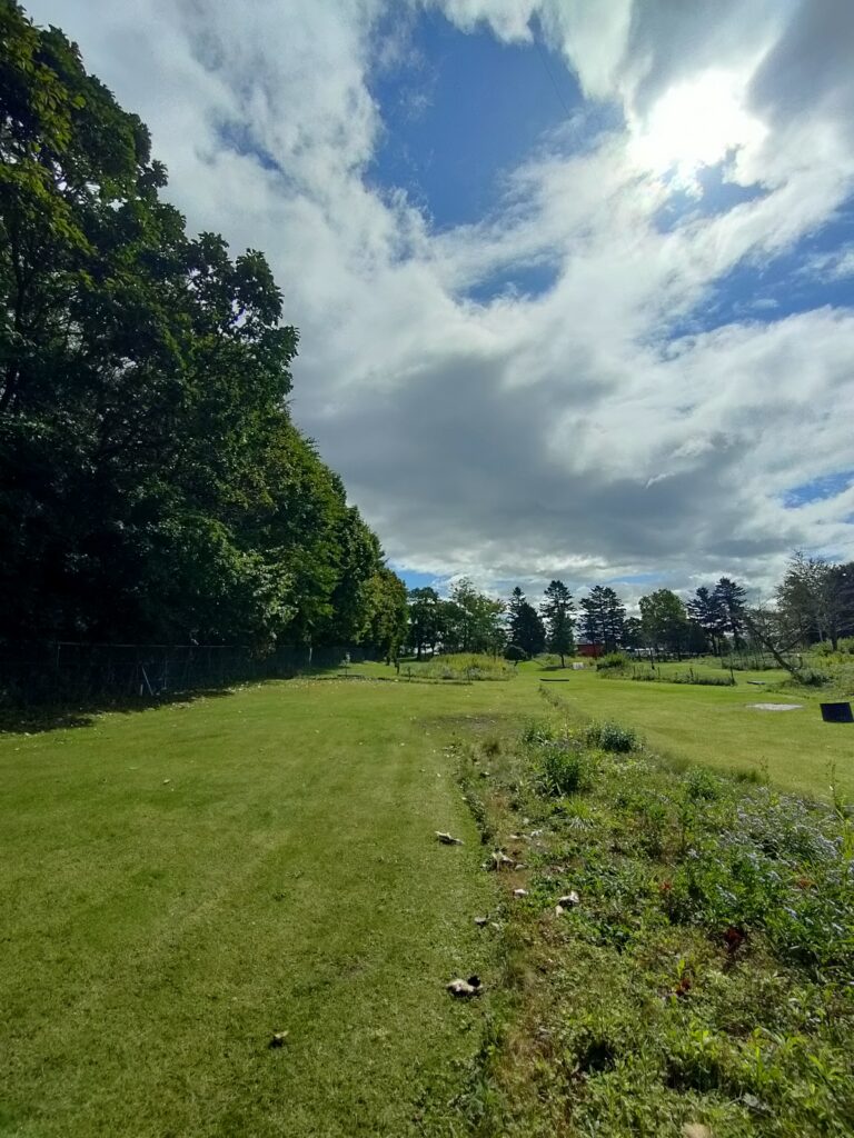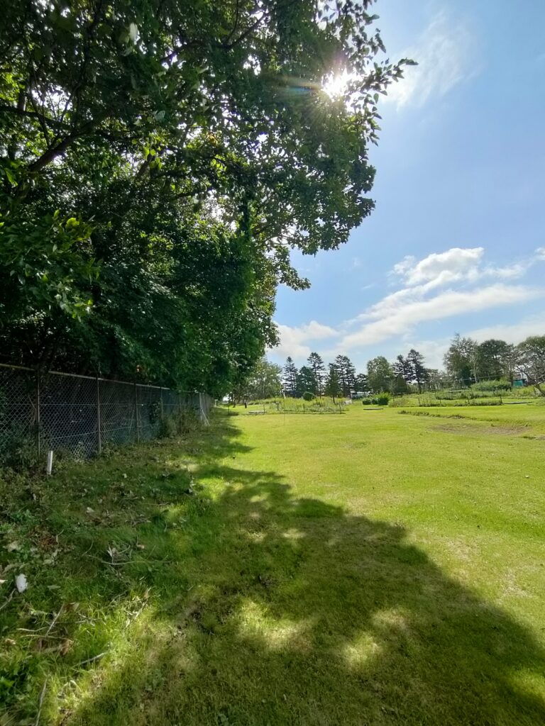 沢山の木々や川、芝生にススキ等、自然豊かな