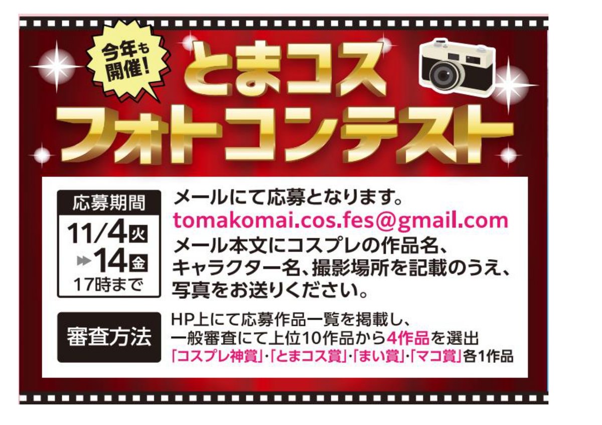 とまコスフォトコンテスト 今年も開催!! 2025.10.272025.10.31 今年も「とまコスフォトコンテスト」開催します! 応募期間:11月4日(火)から11月14日(金)17時まで 応募方法:「tomakomai.cos.fes@gmail.com」に ・コスプレの作品名 ・キャラクター名 ・撮影場所 以上3つを記載の上、写真をお送りください。 *メールのみでの応募となります。 審査方法 このホームページ上で、応募作品一覧を掲載し、 一般審査にて上位10作品から4作品を選出。 ・コスプレ神賞 ・とまコス賞 ・まい賞 ・マコ賞 各1作品。